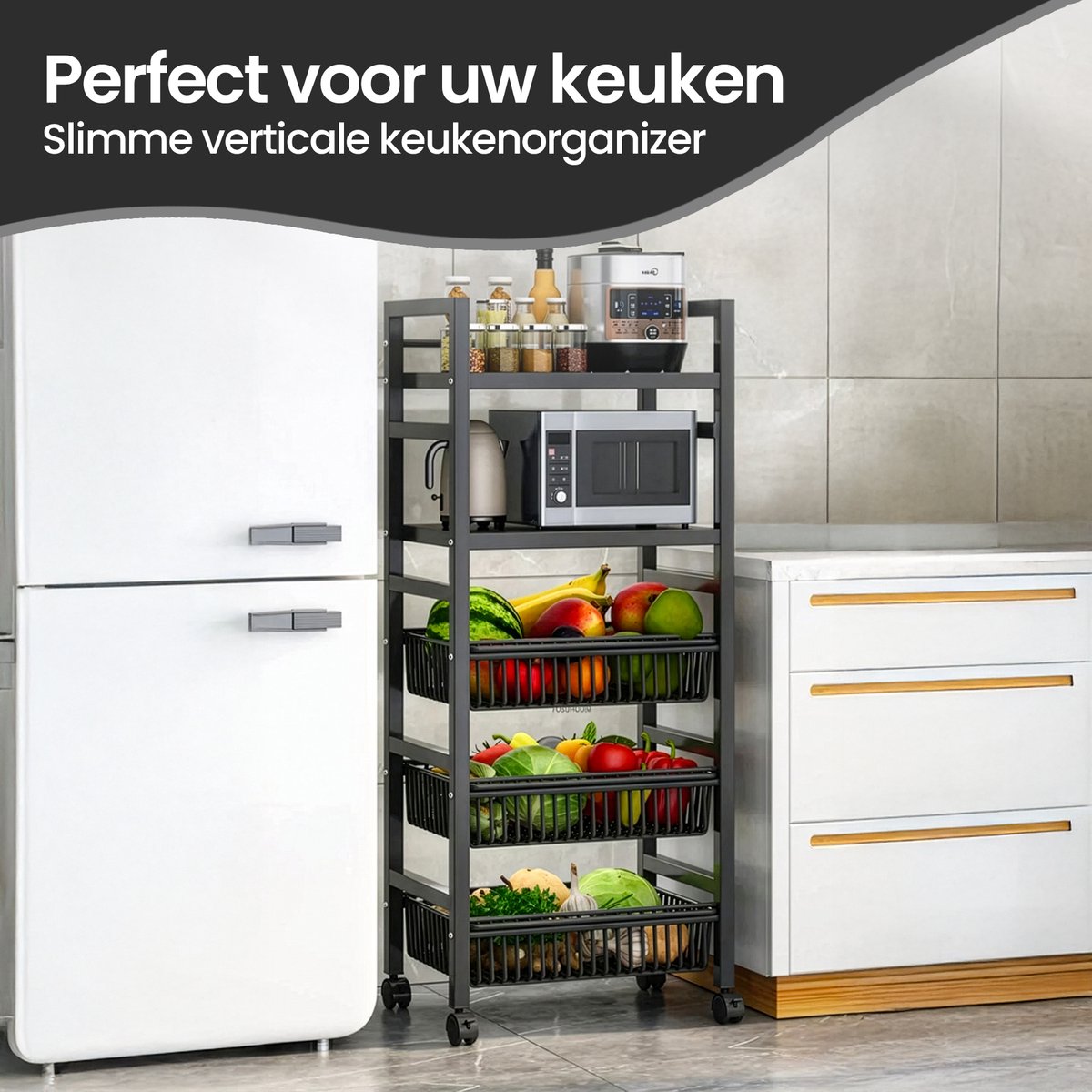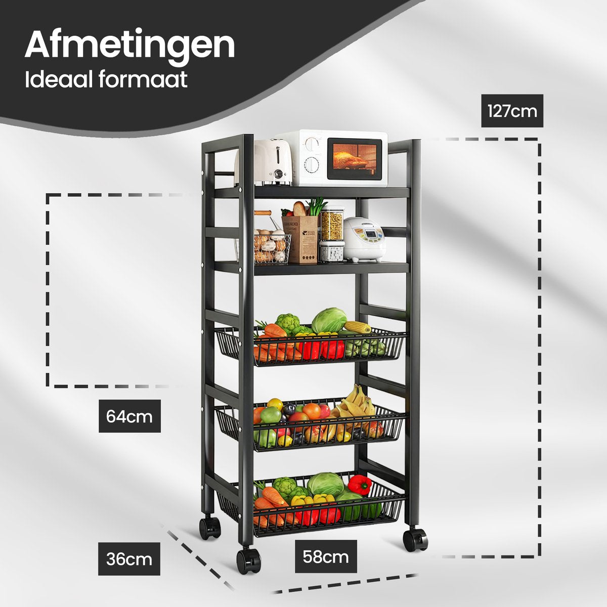 Velox Goods VL-518 Kitchen Shelves – Sturdy Storage Rack with 5 Layers – Mobile Metal Kitchen Rack with Mesh Baskets – Suitable for Microwave, Fruit, Vegetable & Kitchen Equipment – Black – 58x36x127 cm
