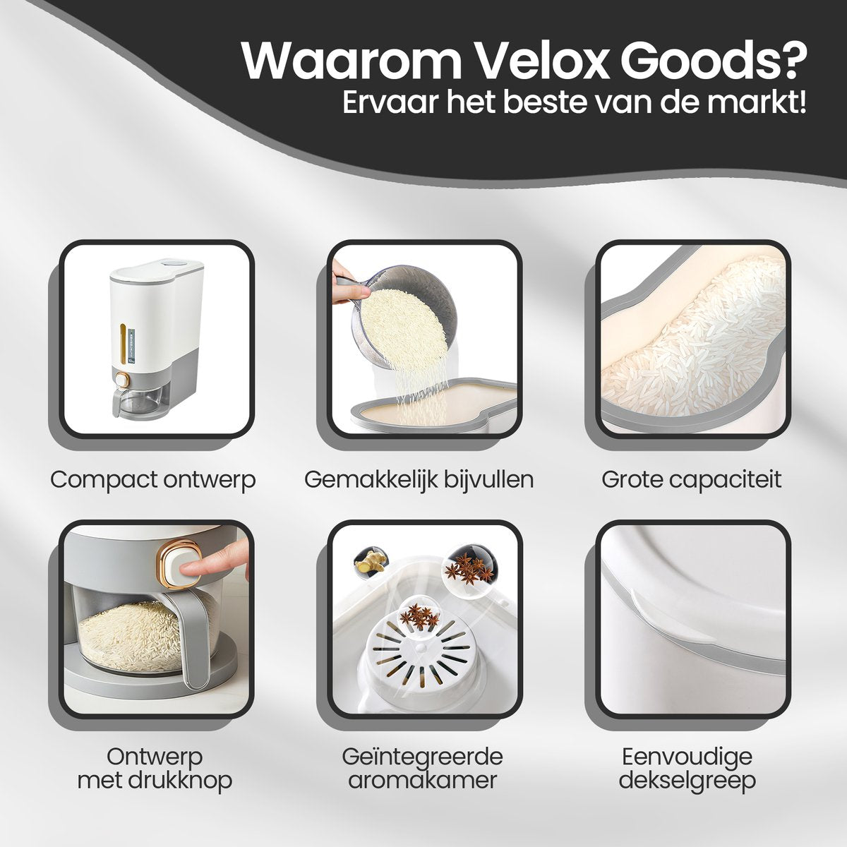 Velox Goods combines smart solutions with sleek design. The VL‑531 rice dispenser is specially designed to make your inventory management in the kitchen easy and clear. No more messy bags of –, but a clean, hygienic and stylish storage solution that really works.